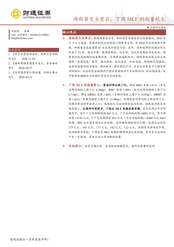 【财通证券】【20241110】特朗普交易重启,下周MLF到期量较大-15页