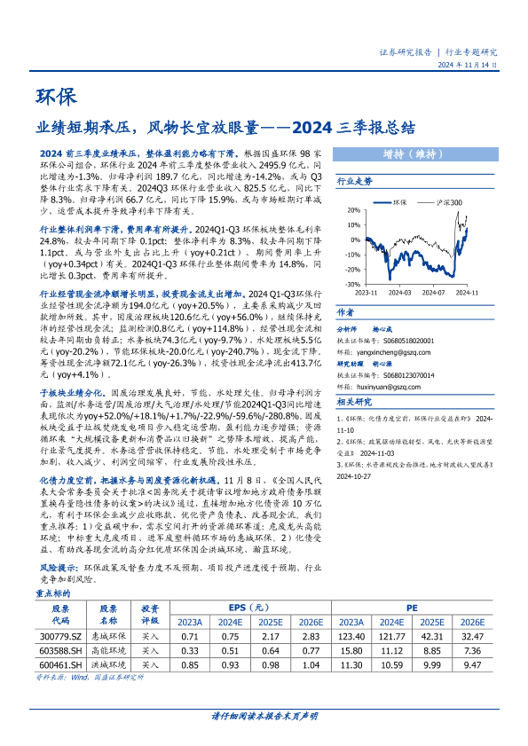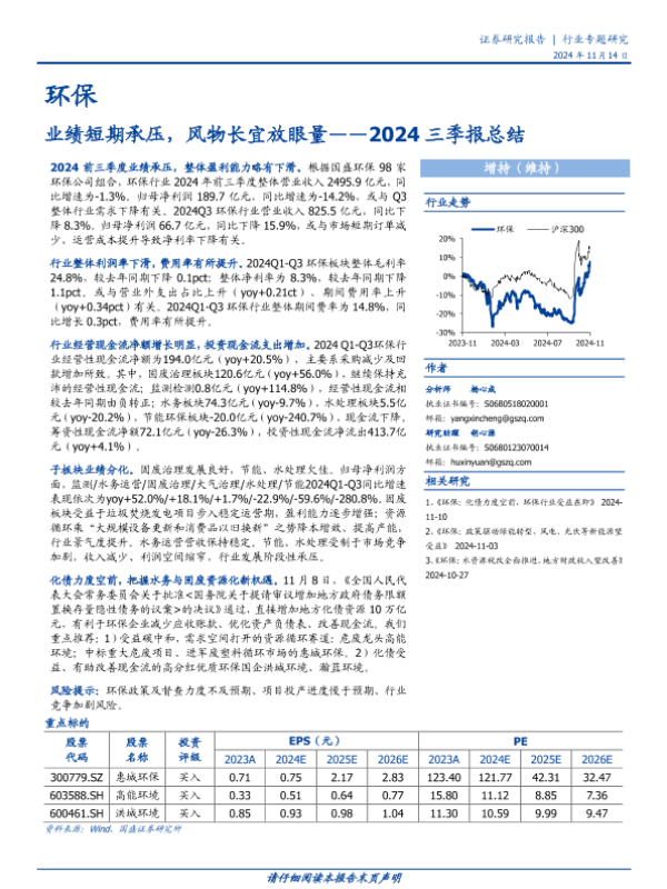 【国盛证券】【20241114】环保行业2024三季报总结:业绩短期承压,风物长宜放眼量-23页