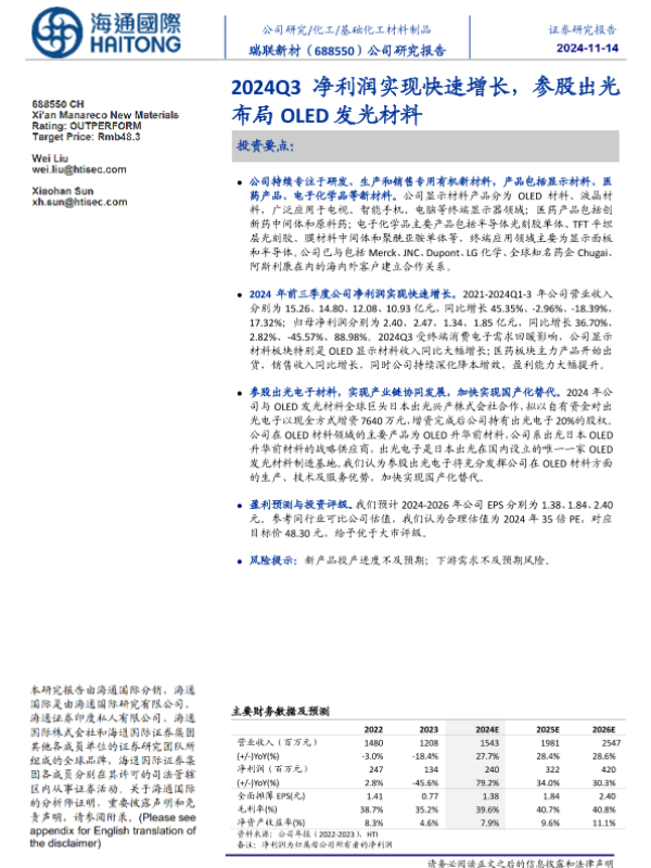 【海通国际】【20241114】瑞联新材(688550)2024Q3净利润实现快速增长,参股出光布局OLED发光材料-12页