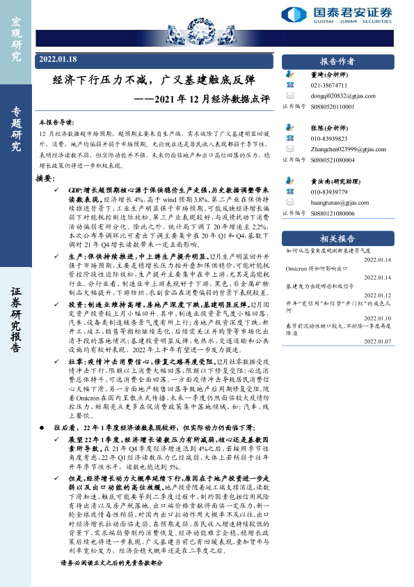 【国泰君安证券】【20220118】2021年12月经济数据点评:经济下行压力不减,广义基建触底反弹-22页