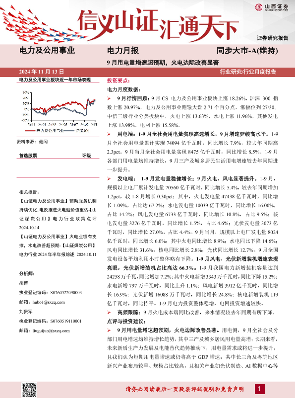 【山西证券】【20241113】电力行业月报:9月用电量增速超预期,火电边际改善显著-21页