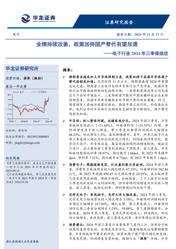 【华龙证券】【20241112】电子行业2024年三季报综述:业绩持续改善,政策加持国产替代有望加速-21页