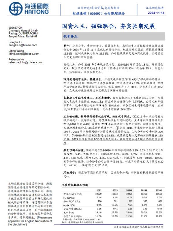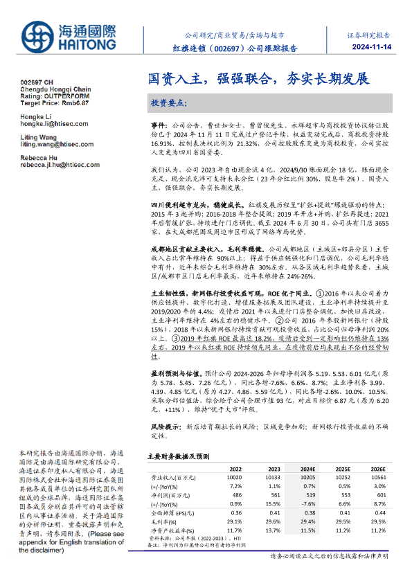 【海通国际】【20241114】红旗连锁(002697)公司跟踪报告:国资入主,强强联合,夯实长期发展-16页