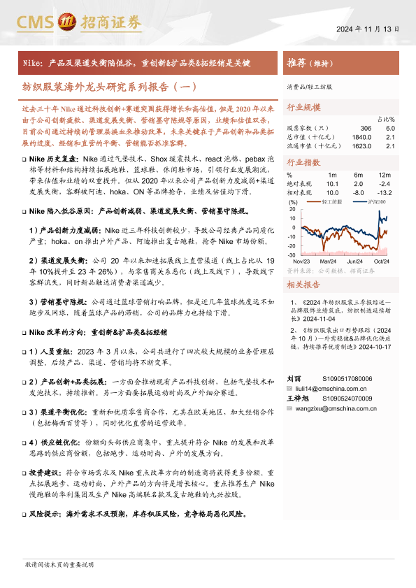 【海通证券】【20241113】纺织服装行业海外龙头研究系列报告(一):Nike,产品及渠道失衡陷低谷,重创新&扩品类&拓经销是关键-11页