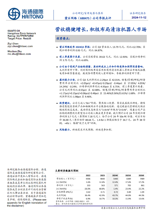 【海通国际】【20241112】萤石网络(688475)营收稳健增长,积极布局清洁机器人市场-11页