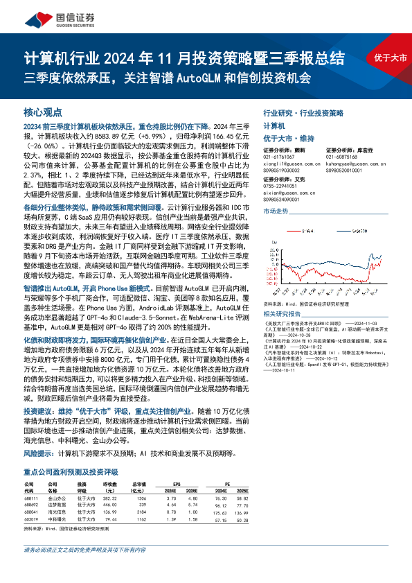 【国信证券】【20241110】计算机行业2024年11月投资策略暨三季报总结:三季度依然承压,关注智谱AutoGLM和信创投资机会-18页