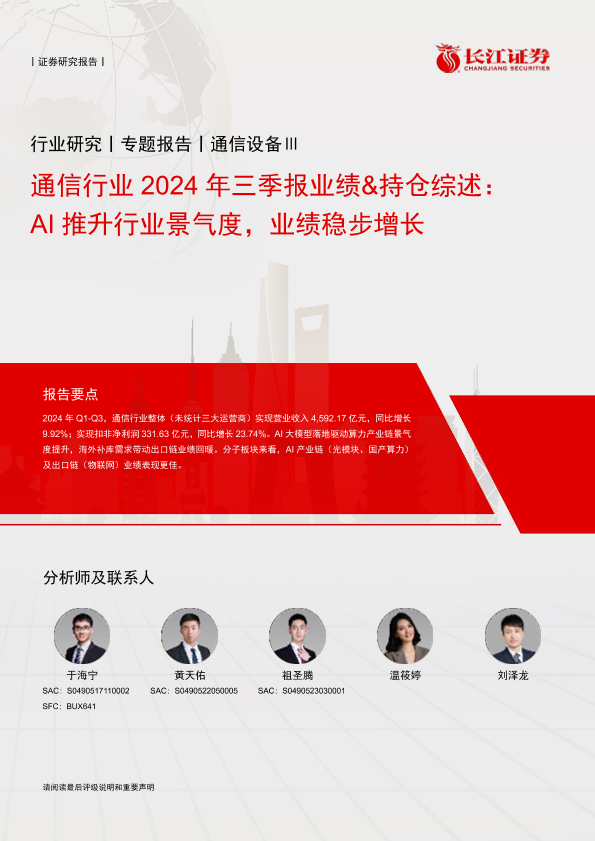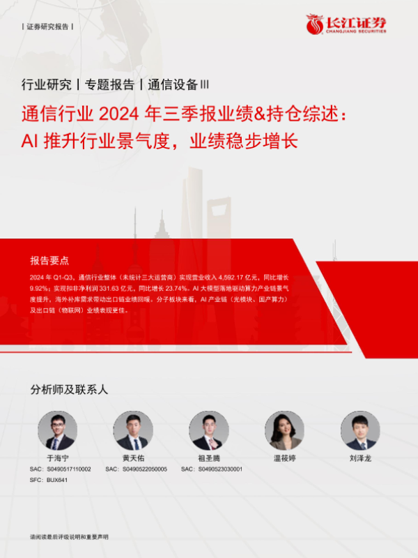 【长江证券】【20241111】通信行业2024年三季报业绩&持仓综述:AI推升行业景气度,业绩稳步增长-18页
