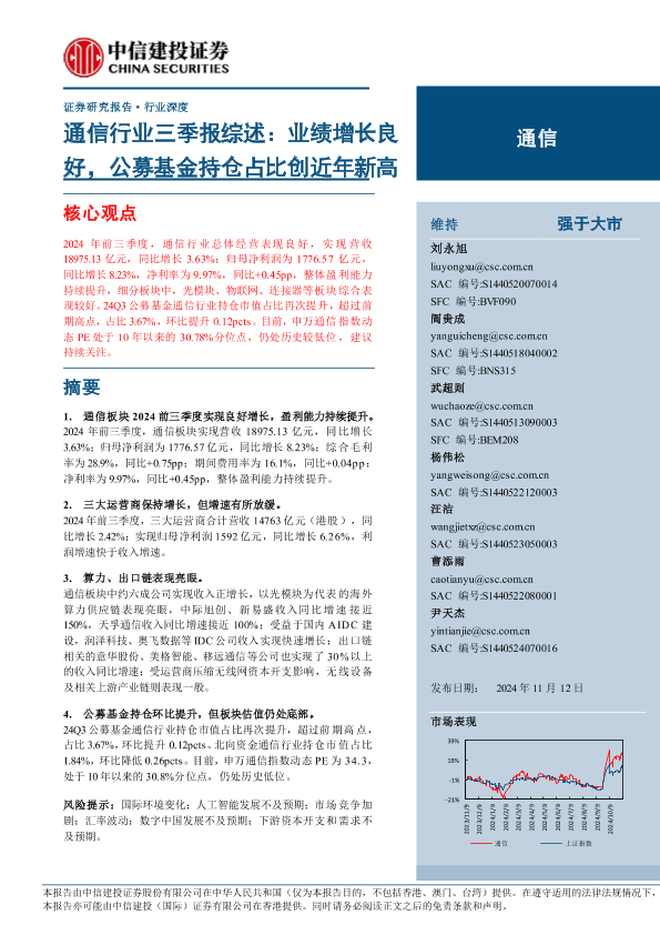 【中信建投证券】【20241112】通信行业三季报综述:业绩增长良好,公募基金持仓占比创近年新高-22页