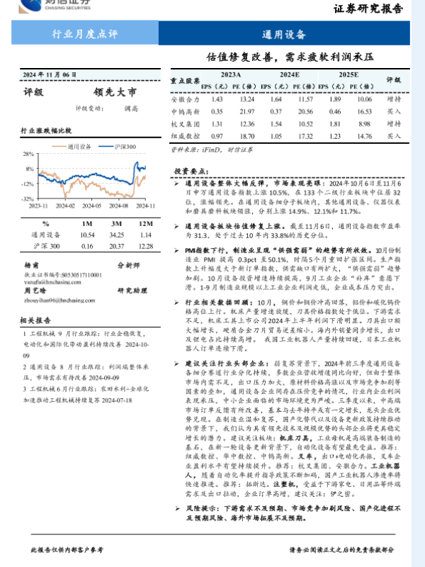 【财信证券】【20241106】通用设备行业月度点评:估值修复改善,需求疲软利润承压-15页