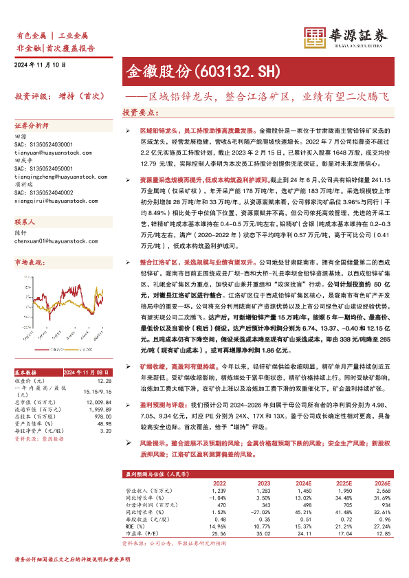 【华源证券】【20241110】金徽股份(603132)区域铅锌龙头,整合江洛矿区,业绩有望二次腾飞-23页