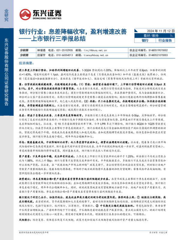 【东兴证券】【20241112】银行行业上市银行三季报总结:息差降幅收窄,盈利增速改善-13页