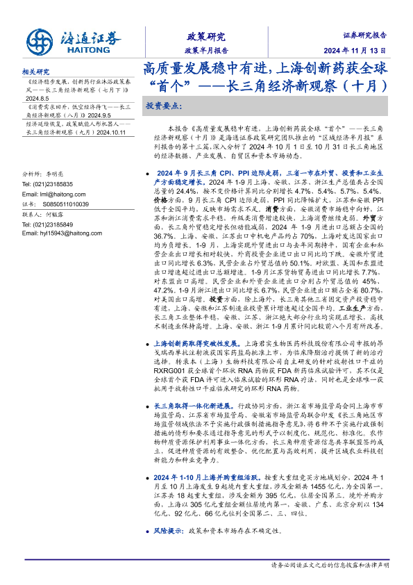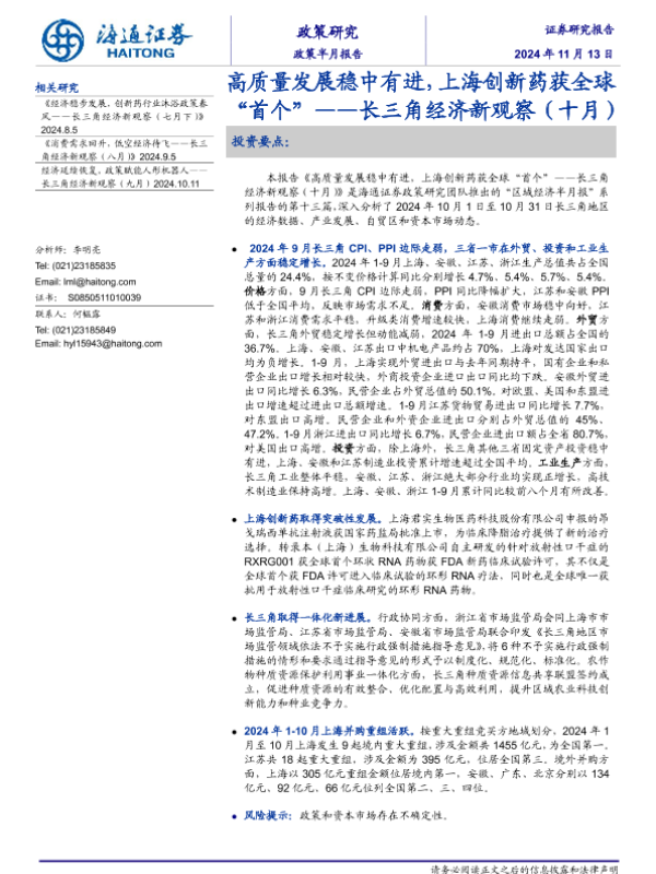 【海通证券】【20241113】高质量发展稳中有进,上海创新药获全球“首个”——长三角经济新观察(十月)-13页