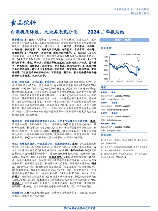 【国盛证券】【20241111】食品饮料行业2024三季报总结:白酒提质降速,大众品表现分化-40页