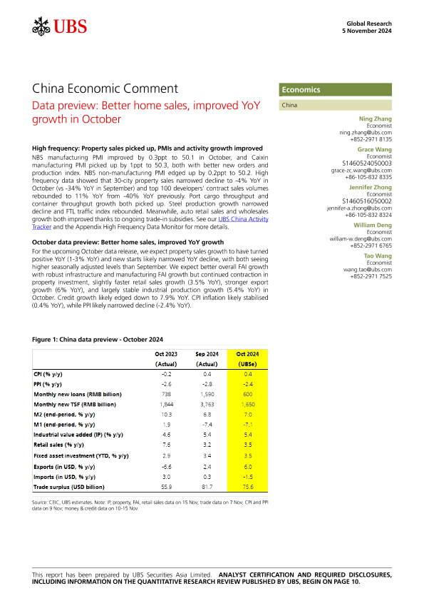 【UBS Securities Asia Limited】【20241105】ics-China Economic Comment _Data preview Better home sales, improved YoY growth-13页