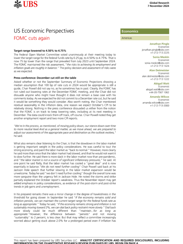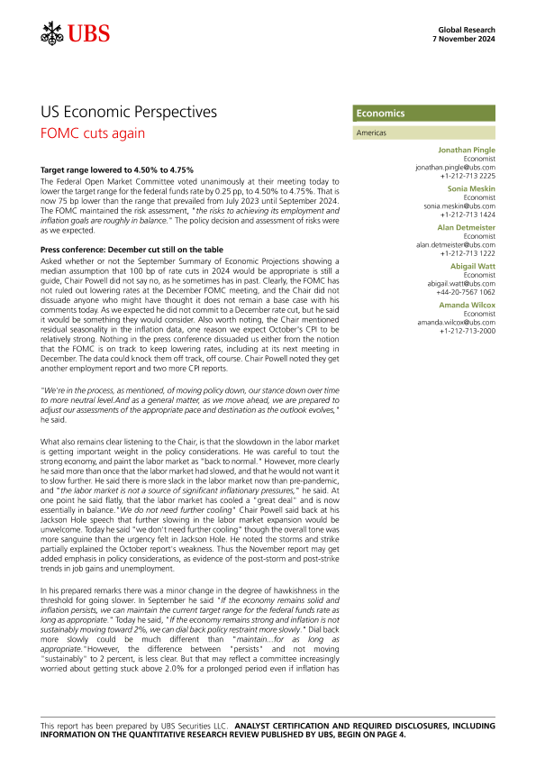 【UBS Securities LLC】【20241107】US Economic Perspectives FOMC cuts again-7页