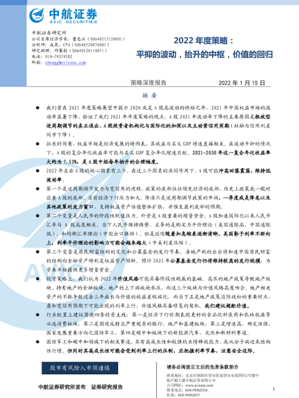 【中航证券】【20220115】2022年度策略:平抑的波动,抬升的中枢,价值的回归-44页