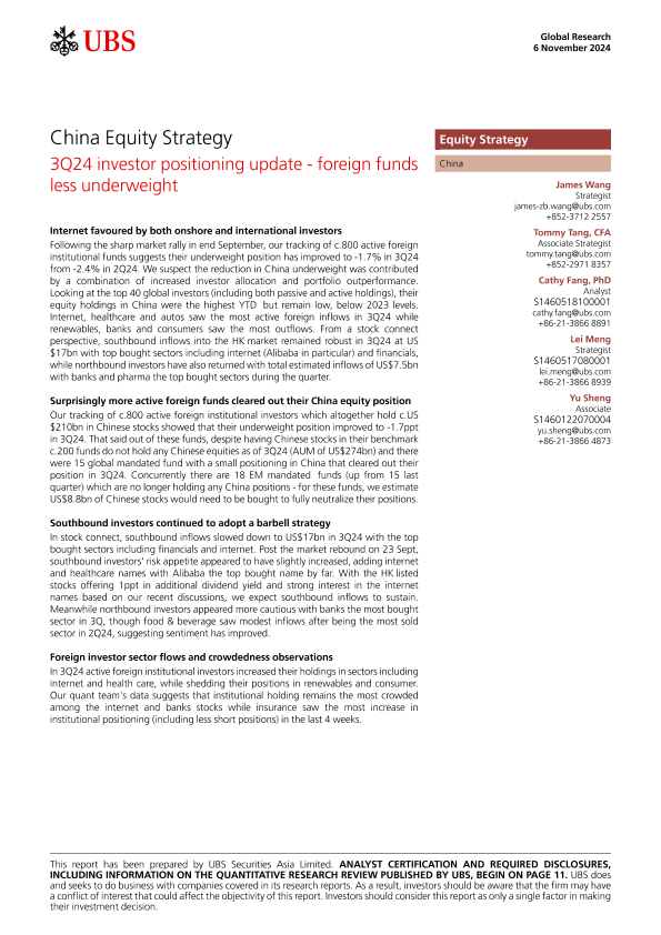 【UBS Securities Asia Limited】【20241106】es-China Equity Strategy _3Q24 investor positioning update-15页