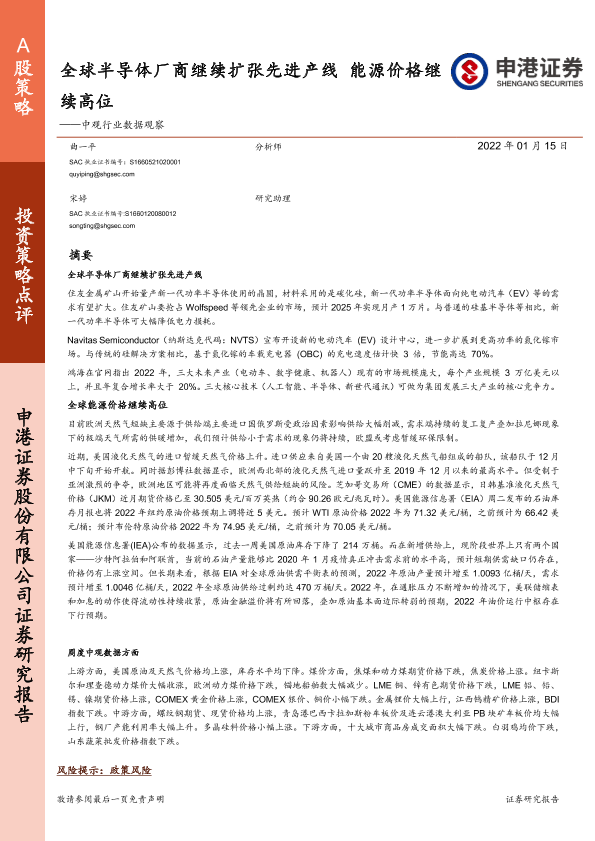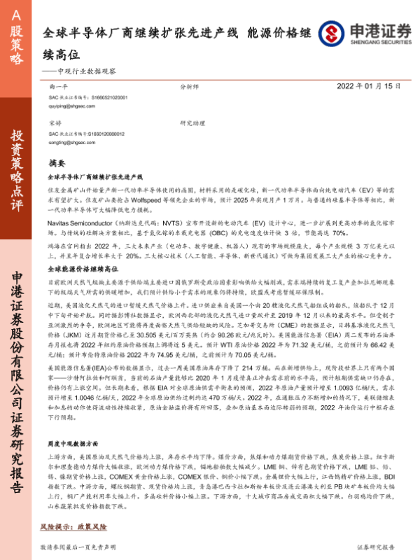 【申港证券】【20220115】中观行业数据观察:全球半导体厂商继续扩张先进产线,能源价格继续高位-39页