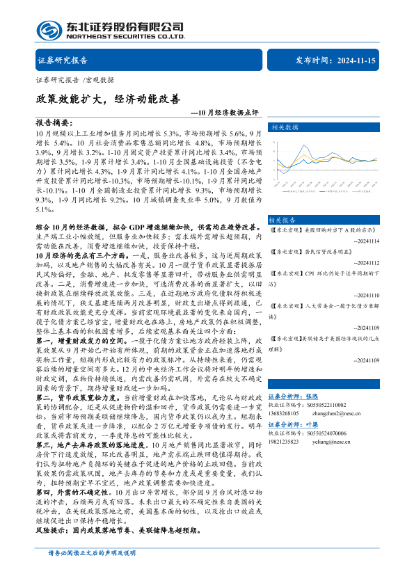 【东北证券】【20241115】10月经济数据点评:政策效能扩大,经济动能改善-13页