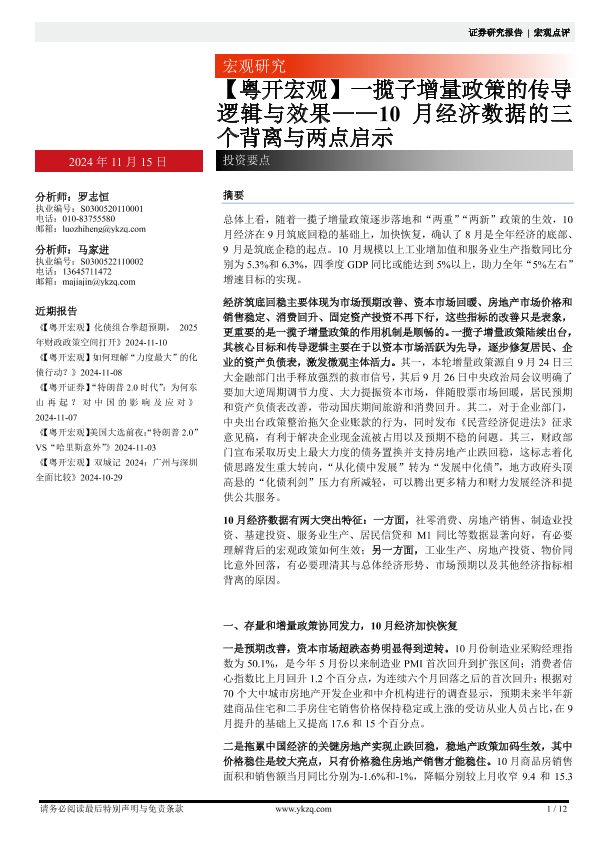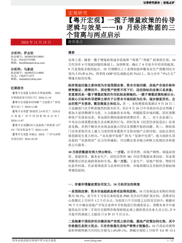 【粤开证券】【20241115】【粤开宏观】10月经济数据的三个背离与两点启示:一揽子增量政策的传导逻辑与效果-12页