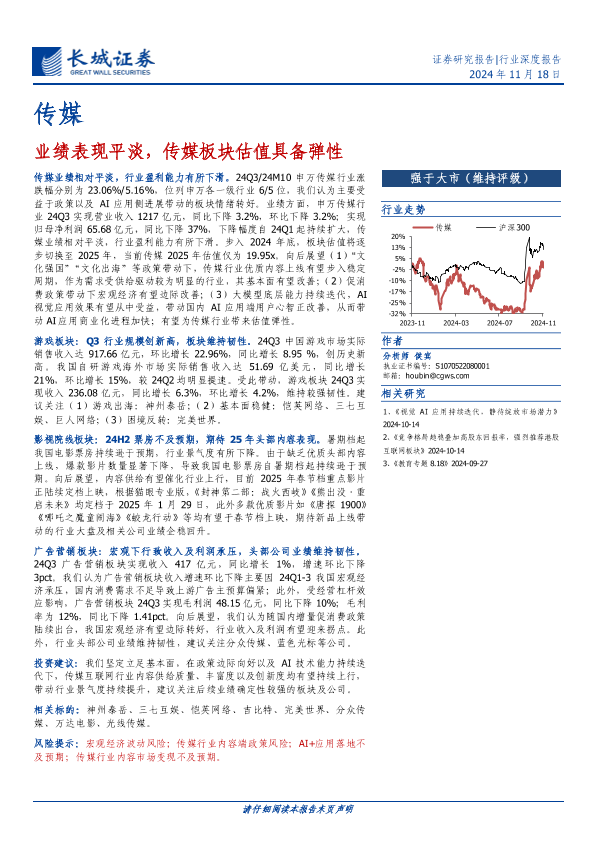 【长城证券】【20241118】传媒行业:业绩表现平淡,传媒板块估值具备弹性-28页