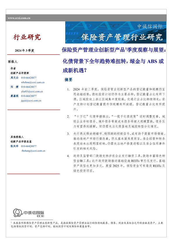 【中诚信国际】【20241119】保险资产管理行业:保险资产管理业创新型产品1季度观察与展望,化债背景下全年趋势难扭转,绿金与ABS或成新机遇?-12页