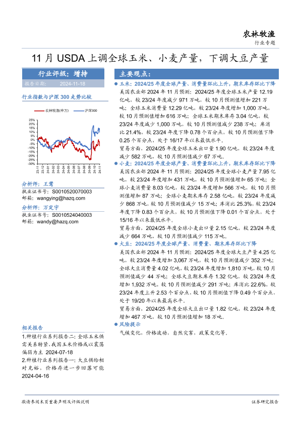 【华安证券】【20241118】农林牧渔行业专题:11月USDA上调全球玉米、小麦产量,下调大豆产量-20页