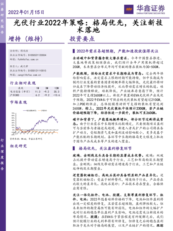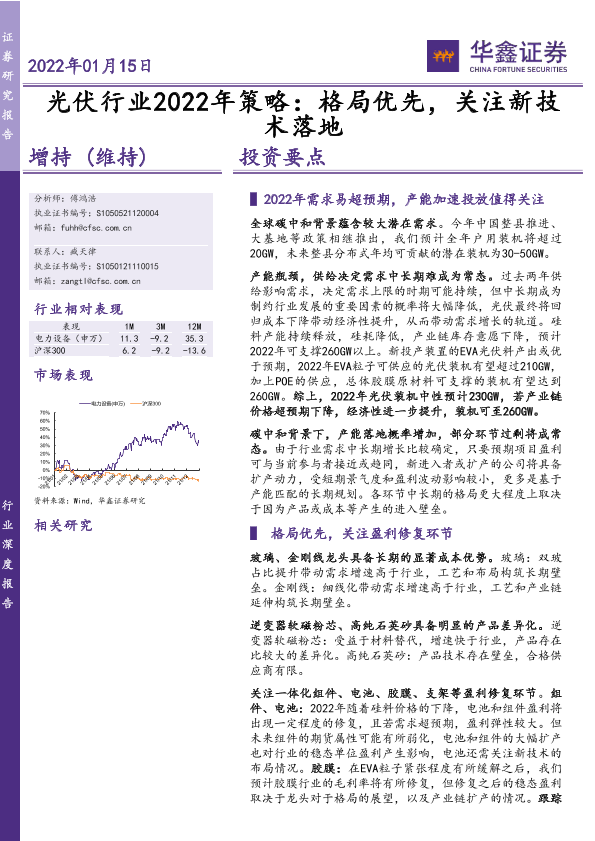 【华鑫证券】【20220115】光伏行业2022年策略:格局优先,关注新技术落地-20页