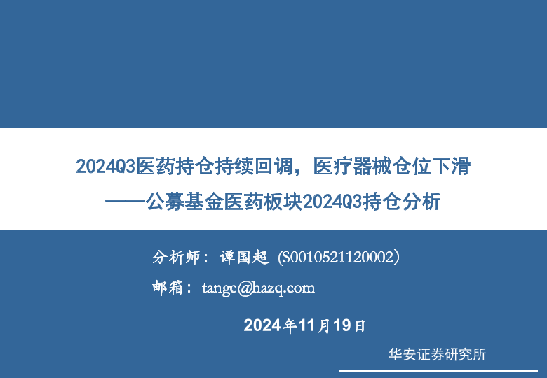 【华安证券】【20241119】医药行业公募基金医药板块2024Q3持仓分析:2024Q3医药持仓持续回调,医疗器械仓位下滑-11页