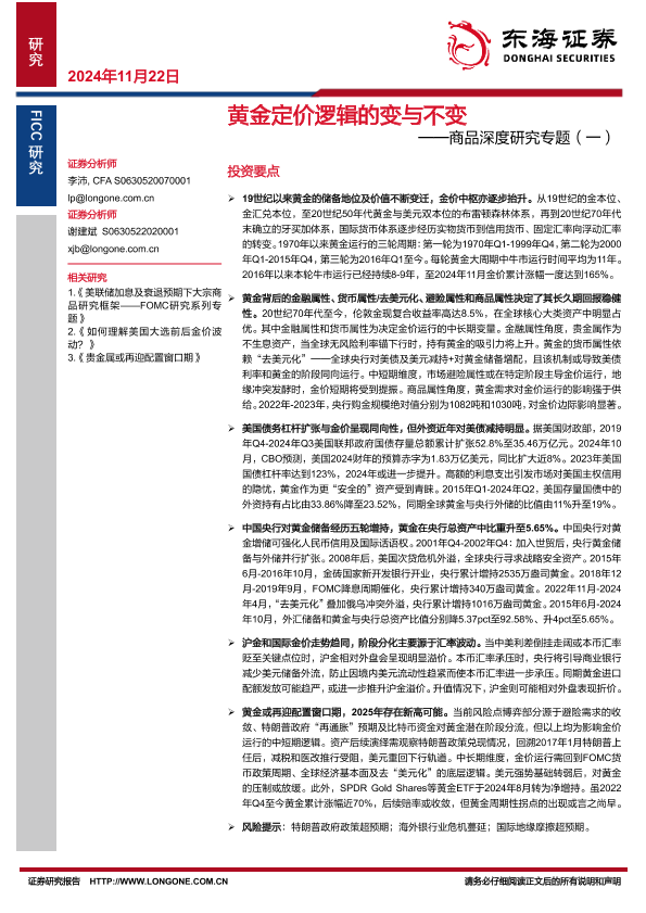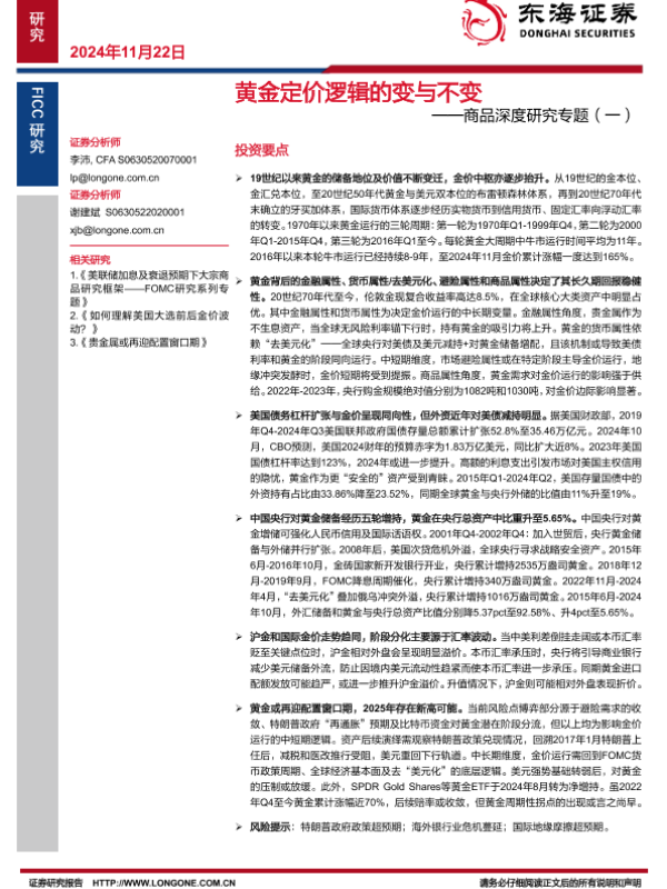 【东海证券】【20241122】黄金定价逻辑的变与不变-27页