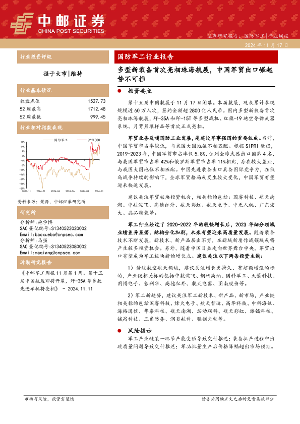 【中邮证券】【20241117】国防军工行业报告:多型新装备首次亮相珠海航展,中国军贸出口崛起势不可挡-22页
