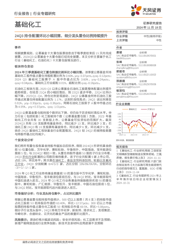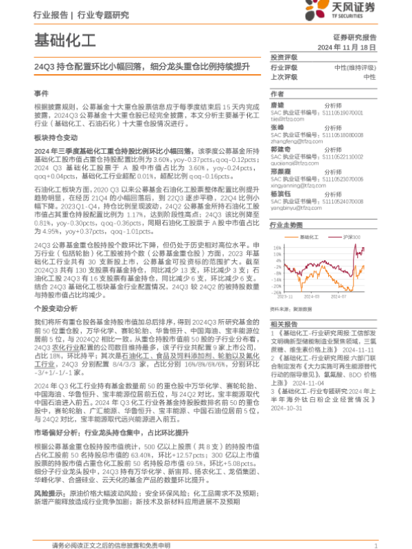 【天风证券】【20241118】基础化工行业专题研究:24Q3持仓配置环比小幅回落,细分龙头重仓比例持续提升-17页
