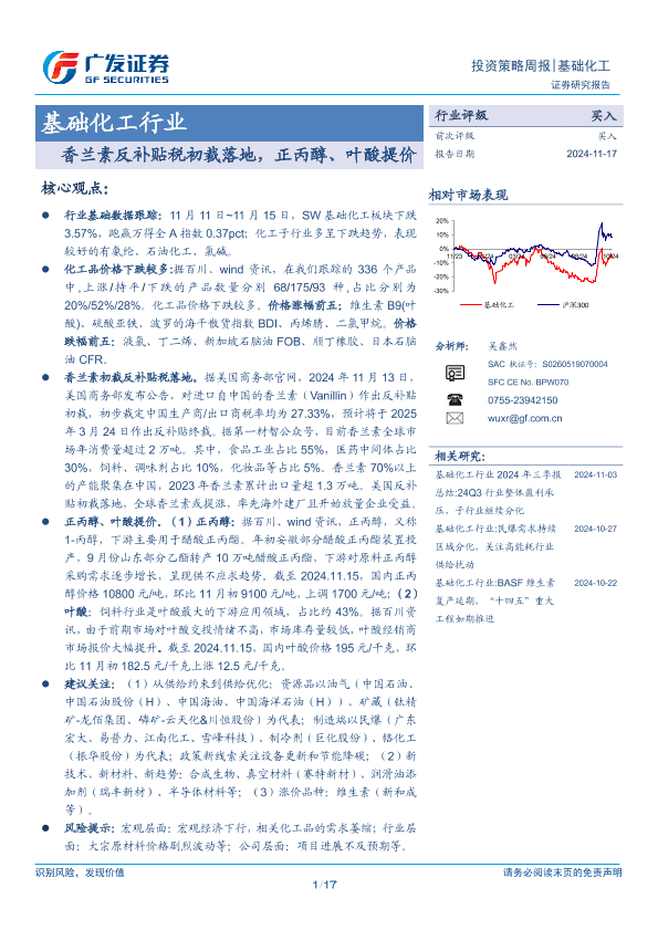 【广发证券】【20241117】基础化工行业:香兰素反补贴税初裁落地,正丙醇、叶酸提价-17页