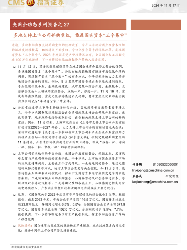 【海通证券】【20241117】央国企动态系列报告之27:多地支持上市公司并购重组,推进国有资本“三个集中”-28页