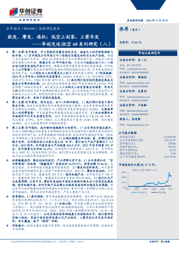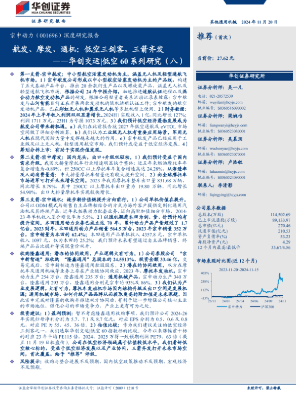 【华创证券】【20241120】宗申动力(001696)深度研究报告:华创交运|低空60系列研究(八),航发、摩发、通机:低空三剑客,三箭齐发-27页