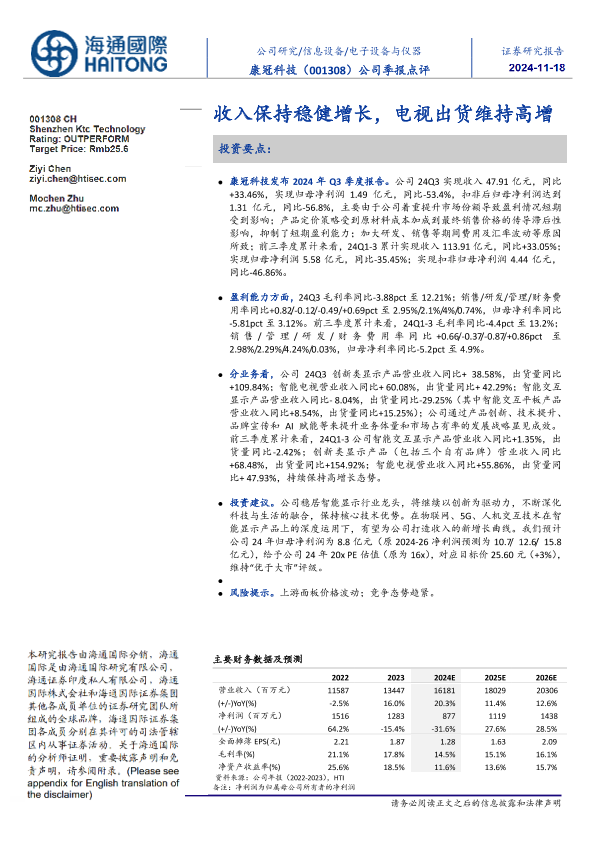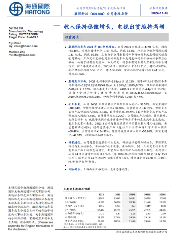 【海通国际】【20241117】康冠科技(001308)公司季报点评:收入保持稳健增长,电视出货维持高增-11页