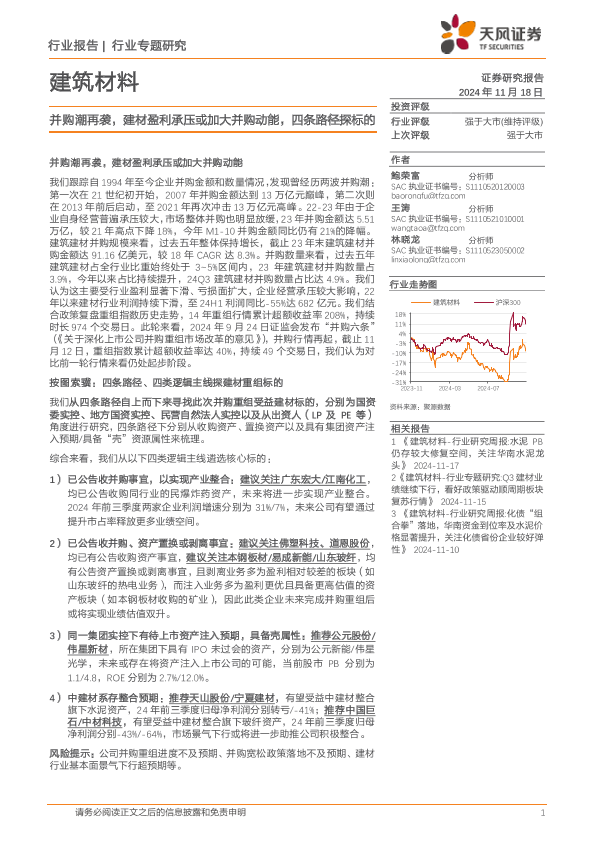 【天风证券】【20241118】建筑材料行业专题研究:并购潮再袭,建材盈利承压或加大并购动能,四条路径探标的-13页