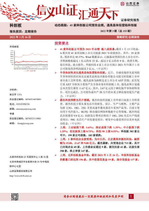 【山西证券】【20220116】动态跟踪2022年第3期(总153期):41家科创板公司预告业绩,通美晶体拟登陆科创板-23页