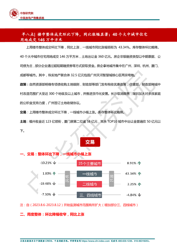 【中指研究院】【202411】房地产行业早八点:楼市整体成交环比下降,同比涨幅显著;40个大中城市住宅用地成交146万平方米-11页