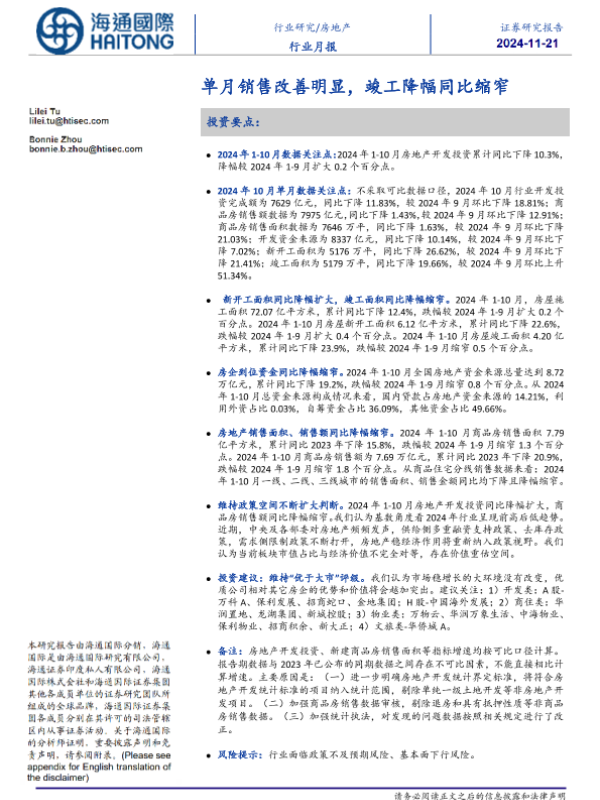 【海通国际】【20241121】房地产行业月报:单月销售改善明显,竣工降幅同比缩窄-19页