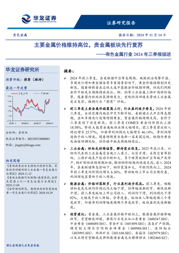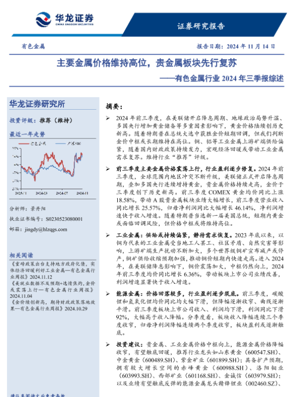 【华龙证券】【20241114】有色金属行业2024年三季报综述:主要金属价格维持高位,贵金属板块先行复苏-19页