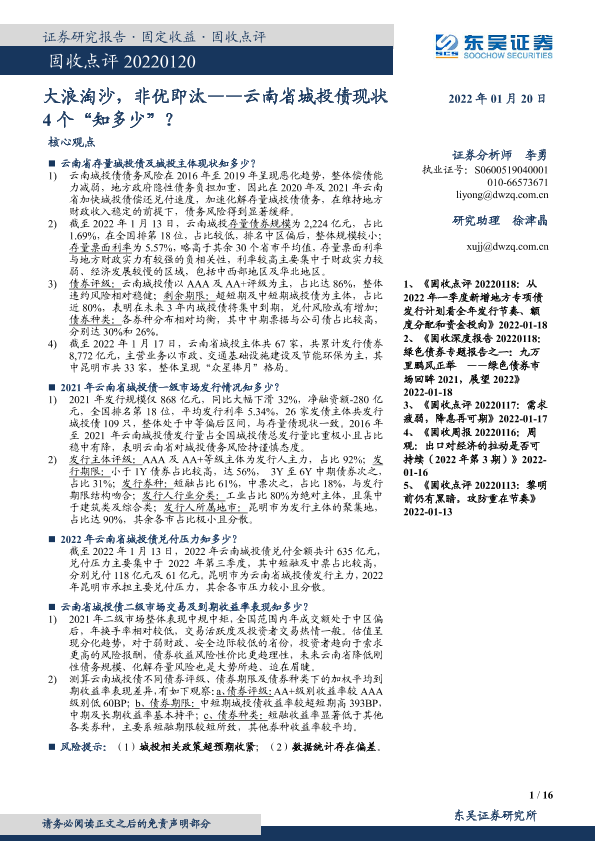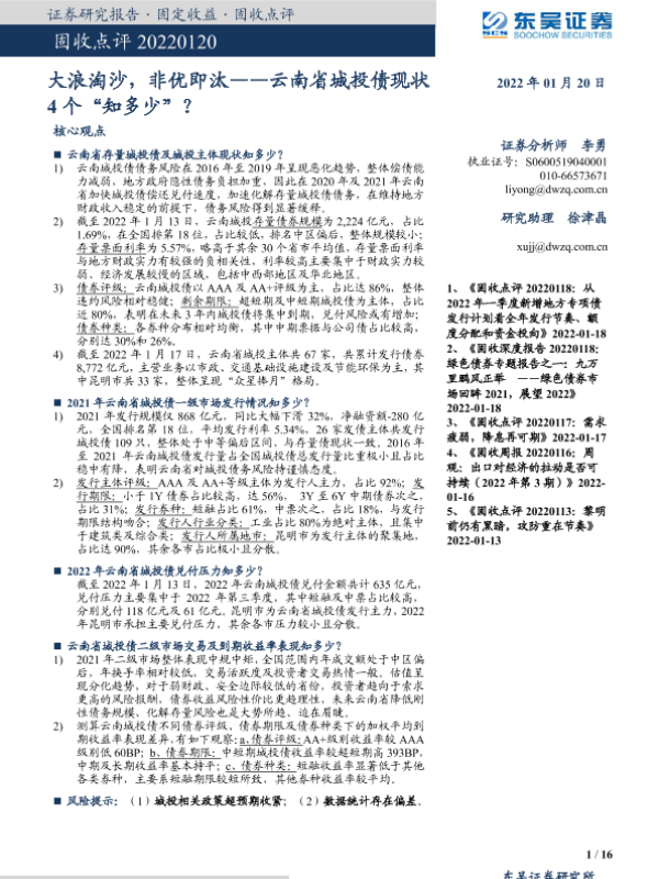 【东吴证券】【20220120】固收点评:云南省城投债现状4个“知多少”?大浪淘沙,非优即汰-16页