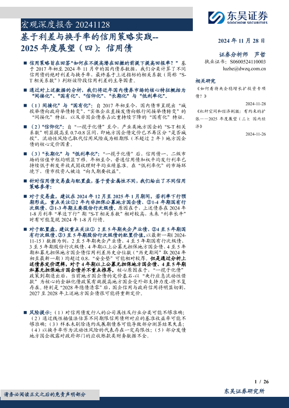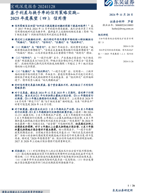 【东吴证券】【20241128】2025年度展望(四):信用债,基于利差与换手率的信用策略实践-26页
