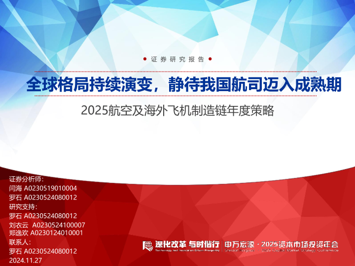 【申万宏源】【20241127】2025航空及海外飞机制造链行业年度策略:全球格局持续演变,静待我国航司迈入成熟期-31页