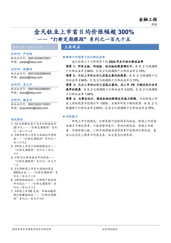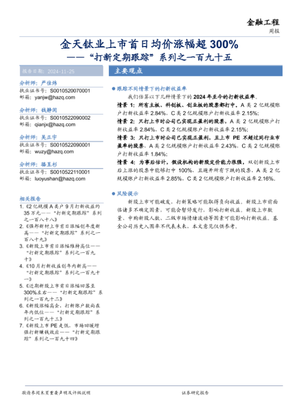 【华安证券】【20241125】“打新定期跟踪”系列之一百九十五:金天钛业上市首日均价涨幅超300%-16页