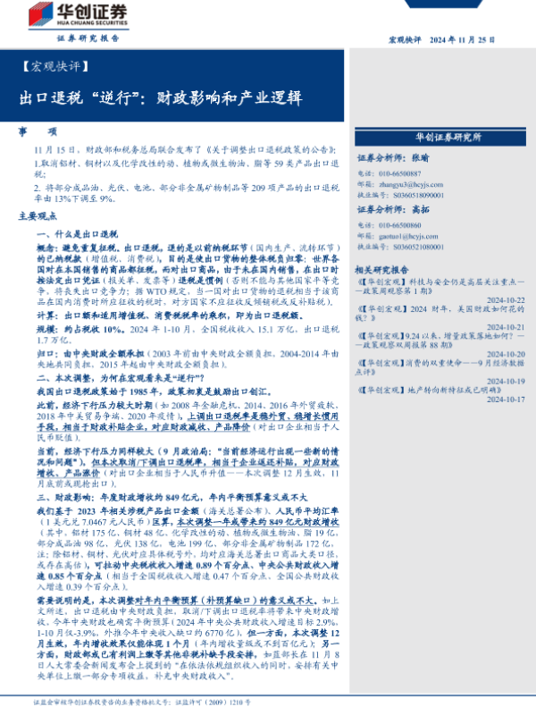 【华创证券】【20241125】【宏观快评】出口退税“逆行”:财政影响和产业逻辑-10页