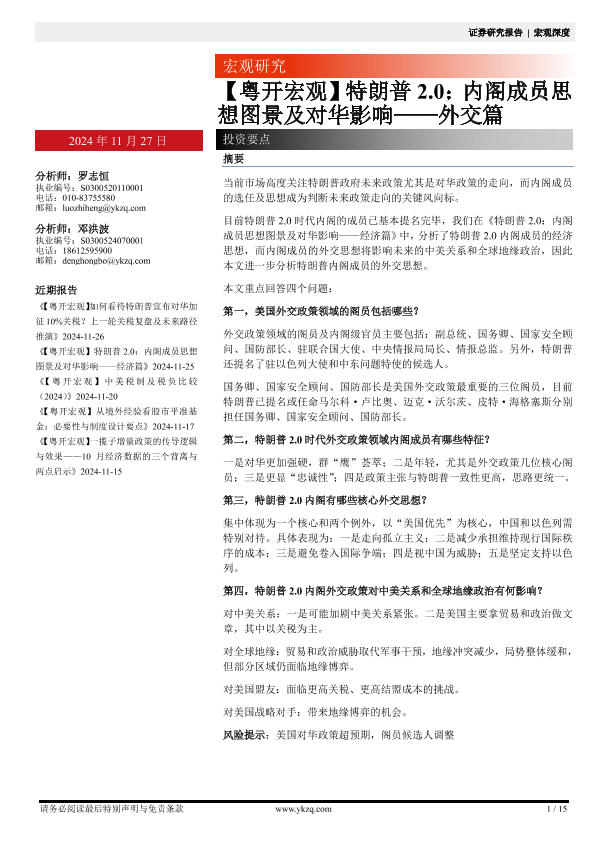 【粤开证券】【20241127】【粤开宏观】特朗普2.0:内阁成员思想图景及对华影响——外交篇-15页