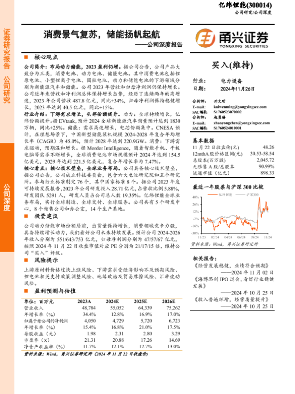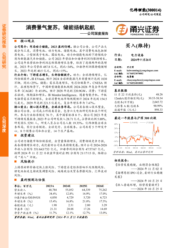 【甬兴证券】【20241126】亿纬锂能(300014)公司深度报告:消费景气复苏,储能扬帆起航-21页