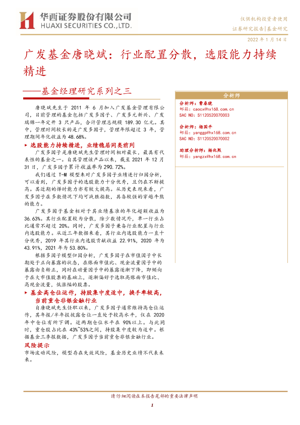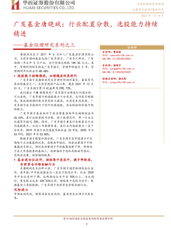 【华西证券】【20220114】基金经理研究系列之三:广发基金唐晓斌,行业配置分散,选股能力持续精进-15页