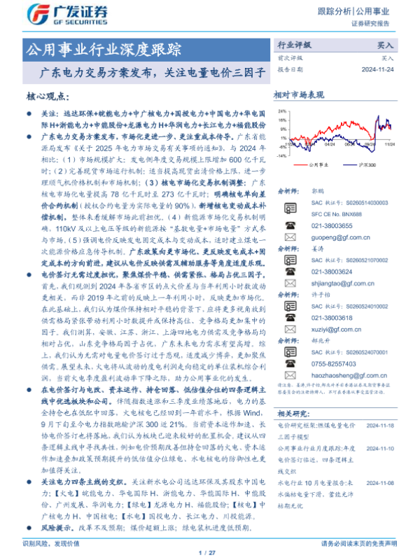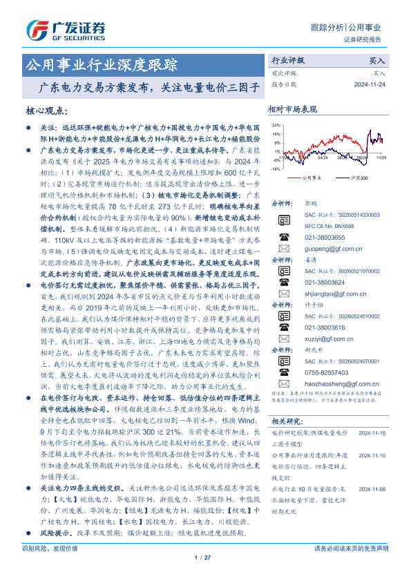 【广发证券】【20241124】公用事业行业深度跟踪:广东电力交易方案发布,关注电量电价三因子-27页